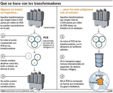 La limpieza de los transformadores se hace en el país, siempre y cuando no posean más de 5.000 ppm, que es una proporción muy alta, correspondiente a los transformadores que utilizaban PCB puro como refrigerante. Esos deben ser exportados a países que poseen tecnología para descontaminarlos (ver Qué se...). La mayor parte de los transformadores utilizaban el PCB disuelto en aceite de refrigeración.