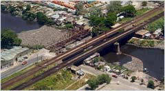 En el puente Bosch, que cruza el Riachuelo a la altura de Barracas, se realizan tareas de limpieza de espejo en la superficie del Riachuelo