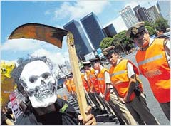 | Protesta y panfletos frente a Buquebus La protesta fue tan ordenada como una danza en la que cada bailarín aprendió bien los pasos. Cinco representantes de la Asamblea de Gualeguaychú, apoyados por unos 300 militantes de organizaciones vecinales y partidos de izquierda, volvieron a repartir ayer, en la entrada de la terminal de Buquebus, en Puerto Madero, panfletos contra las papeleras Botnia y ENCE en Uruguay. La fecha coincidió con el recambio de turistas. Los manifestantes llegaron a Puerto Madero a las 12 escoltados por unos cincuenta policías. Mientras se acomodaban, hubo algún embotellamiento, pero todo se ordenó rápidamente. Al ritmo de tambores y trompetas o de las canciones "antipapeleras" (una era la cumbia "Bombón Asesino", con la letra cambiada) que sonaban desde una camioneta, los asambleístas se ubicaron frente a la empresa de ferrys, del otro lado de la calle. La mayoría estaba detrás de banderas de las Asambleas del Pueblo y frentes vecinales, pero también del MST (hace 15 días, algún dirigente se había quejado de la escasa participación de los partidos de izquierda) y de Quebracho. Ya en Puerto Madero, la protesta fue custodiada por más de 100 efectivos de Prefectura. Los cinco gualeguaychuenses (Ramón Mengochea, Marta Susco, Juan Carlos Barrios, Juan Veronesi y Ricardo Gómez) entregaron sin problemas los panfletos, que casi todos los turistas recibieron cortésmente. También expusieron un discurso unificado ante los medios: insistieron con su rechazo a Botnia, repitieron que "Uruguay ya no es natural" y aseguraron que "los efectos de las papeleras alcanzan un radio de 100 kilómetros y los de ENCE (que se instala en Conchillas, cerca de Colonia) van a llegar a Buenos Aires". También cuestionaron a Clarín por haber difundido el sistema de pases que implementó la Asamblea de Gualeguaychú, para permitir a algunas personas atravesar el corte que mantienen desde hace 14 meses. Por ahí, aseguraron, "puede pasar cualquiera que adhiera a nuestra lucha". La manifestación terminó a las 14 sin incidentes. Rubén Saboulard, de las Asambleas del Pueblo, anticipó que en 15 días repetirán la protesta, "pero no sólo en Buquebus, sino en todos los lugares en los que haya recambio turístico con Uruguay". Clarín le preguntó si eso incluía los aeropuertos, pero no obtuvo respuesta. |
