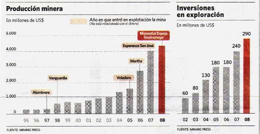 Las estimaciones oficiales indican que "la producción de metales crecerá un 40% en 2009", incluyendo el 78% que crecerá la plata, un incremento exponencial del hierro (de 50.000 a 500.000 toneladas) y 1,6 millón de onzas de oro (20% más que en 2008), con exportaciones de este metal por casi US$ 1.300 millones.