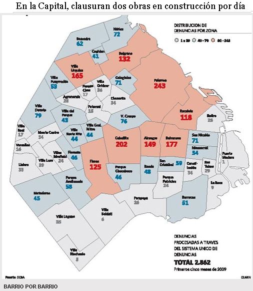 De acuerdo a los registros de la AGC, entre enero y mayo de 2009 ya se han registrado 2.862 denuncias vecinales contra obras en construcción. A la cabeza figuran los barrios preferidos por la actividad inmobiliaria: Palermo y Caballito. En el primero se registraron 243 denuncias y en el segundo, 202. También en 2009 Palermo y Caballito habían sido los barrios con más denuncias, con 708 y 478, respectivamente. Los reclamos se pueden realizar en el teléfono gratuito de la Ciudad, el 147.