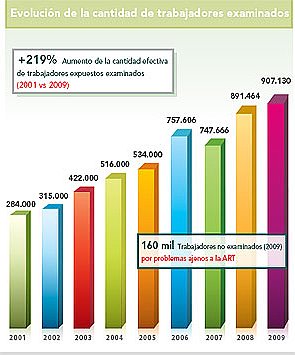 Asimismo, destaca la entidad que "la cantidad de preventores que han visitado y recomendado a las empresas aseguradas continúa creciendo llegando en 2009 a 1.558. Por su parte la cantidad de exámenes médicos periódicos realizados también se ha incrementado en el período 2001-2009 en 219 por ciento".