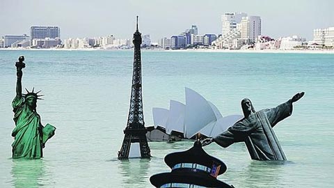 Réplicas de la Torre Eiffel, el Cristo del Corcovado, la Estatua de la Libertad, el Taj Mahal de Agra y la Opera de Sidney semisumergidas en las aguas turquesas de la playa de la Riviera Maya, apenas a unos metros del majestuoso hotel Moon Palace donde se realiza la 16 cumbre de cambio climático. Fueron plantadas por activistas de Greenpeace para graficar las graves consecuencias de no alcanzar un acuerdo entre las 193 naciones aquí presentes.