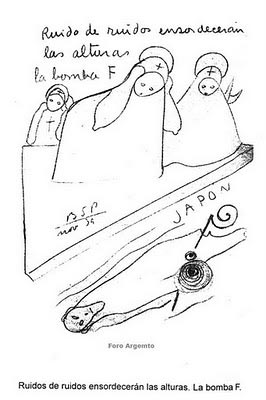 La visión es tremenda, como todas las del autor transmite muchísimo, pero en este caso llama la atención especialmente la silueta de la figura que aparece en la parte inferior, que se asemeja muy vagamente a un mapa de Japón, donde también parece que se sitúa el terremoto con los circulos concéntricos, y que además podría estar marcando a su vez la zona de Fukushima (Aunque realmente, quede más abajo). En fin, ya sabemos como son estas cosas y las exactitudes, pero la dejo aquí porque me impactó realmente al encontrarla, y desde luego, la inscripción de la "bomba F" deja a uno bastante trastornado...