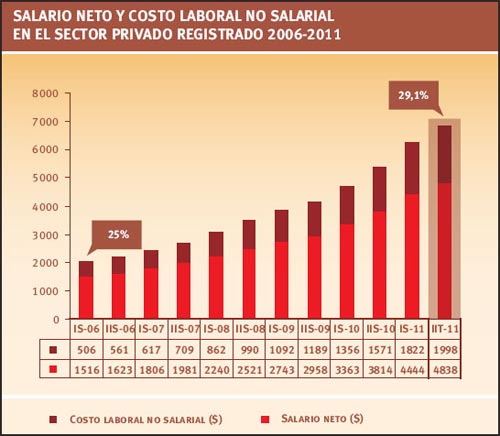 "En el último quinquenio, la proporción del costo no salarial ha crecido más de 4 puntos con relación al costo laboral total y 7 puntos respecto del salario neto. En 2006, en efecto, representaba 25% del costo laboral total y equivalía a 34% del salario neto", advirtió el informe.