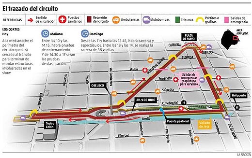 Esta vez, el recorrido será por el triángulo que conforman las avenidas 9 de Julio, Diagonal Norte y De Mayo, a lo largo de 3100 metros y que incluye tres curvas. Toda la zona quedará cerrada al tránsito esta medianoche. Mañana, según el cronograma, se desarrollarán las pruebas de clasificación y entrenamiento; el domingo se correrán las 36 vueltas de la competencia a velocidades que alcanzan los 260 km/h.
