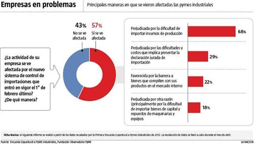 Los datos sobre el impacto de las restricciones para importar en las pequeñas y medianas empresas se desprenden de una encuesta realizada en abril por la Fundación Observatorio Pyme entre 430 industriales de todo el país. El Observatorio Pyme es una entidad sin fines de lucro fundada por la Università di Bologna, la Organización Techint y la Unión Industrial Argentina (UIA), que realiza esta encuesta en forma trimestral desde hace más de siete años.