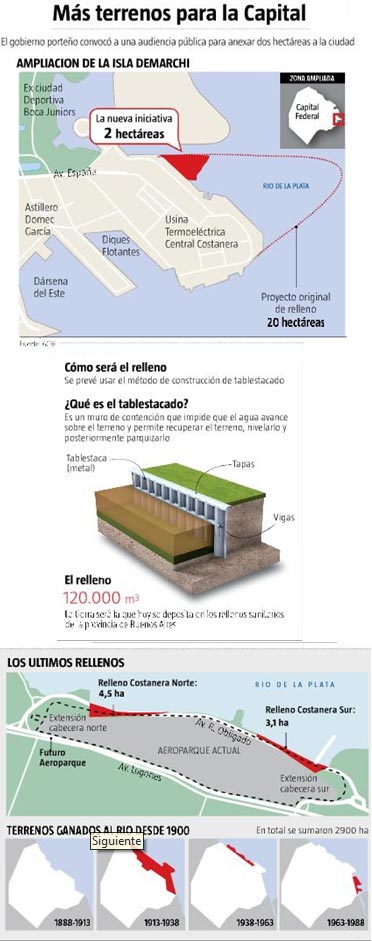 Y agregó, en carácter de miembro del cuerpo colegiado que debe velar por el cumplimiento de la sentencia de la Corte para limpiar el Riachuelo: "Seguimos insistiendo en la necesidad de que ese proyecto sea estudiado y revisado por la Autoridad de Cuenca Matanza Riachuelo (Acumar), porque eventualmente puede incidir en el plan de saneamiento". Nápoli también reclamó mayor difusión del proyecto con detalles específicos. La construcción del relleno sólo comenzaría el año próximo. Es que después de la audiencia pública se realizaría el llamado a licitación para su realización.