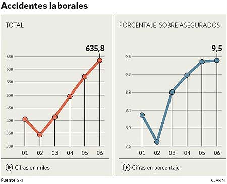 Además se registraron 995 fallecidos cuando en 2005 habían sumado 857. De esos totales, en 2006 hubo 605 muertes en el lugar de trabajo y 395 entre el lugar de trabajo y el domicilio del trabajador ("in itinere").
