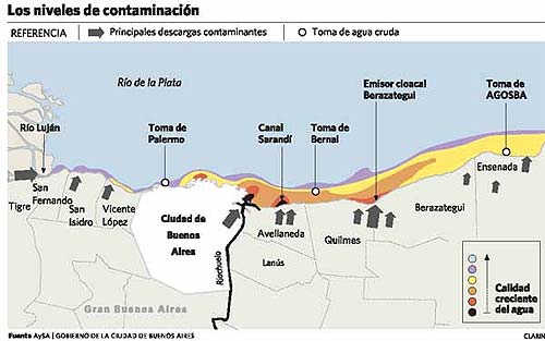 Pero la contaminación no se detiene. El Riachuelo, a pesar del plan para sanearlo, continúa volcando productos tóxicos en el Plata. De igual forma, el emisario cloacal de Berazategui sigue provocando una mancha de 1,5 kilómetro de largo a 2.500 metros de la costa, testimonio de los desechos fecales de 5 millones de habitantes (ver Obras...).
