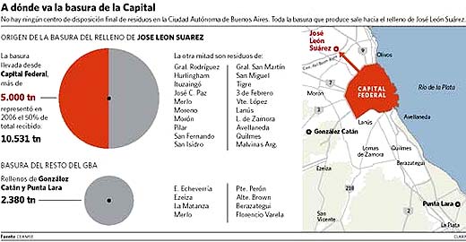 El sistema de recepción de residuos en territorio provincial está en colapso porque faltan lugares dónde colocarlos. Actualmente se generan en el área metropolitana (Capital con los municipios del Conurbano) unas 12 mil toneladas diarias de basura (ver infografía). Sólo la Capital produce 5.000 toneladas por día, y en lo que va del año los porteños generaron un 6% más de residuos que en el mismo lapso de 2006.