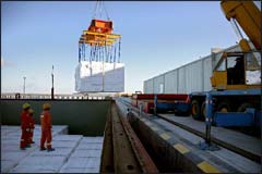 ![]() Botnia descarga su primer embarque en el puerto de Nueva Palmira; en los próximos días llegará una nueva barcaza. Foto: AFP |
