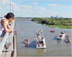 | Festival musical de protesta frente al río Esta vez, fue la música. Los asambleístas de Gualeguaychú realizaron ayer un festival musical en el río Uruguay, junto al puente internacional General San Martín, frente a Botnia. El objetivo: protestar contra la contaminación que traerán las pasteras y sumar a los jóvenes a la lucha. Por eso, los intérpretes de ayer fueron jóvenes músicos y compositores locales. Teclados, batería, cuerdas, sonaron sobre el agua con las letras del rock nacional. Aunque tenía horario de inicio a las 17, finalmente, comenzó pasadas las 19:30. El "escenario" fue un yate de unos 20 metros de eslora. Se lo ubicó al reparo, bajo el puente, dado que el Uruguay se presentaba picado. Potentes equipos amplificaron el sonido para la "platea", ubicada sobre el puente internacional. Allí, unas 500 personas escucharon, aplaudieron y cantaron. La idea fue motorizada por los hermanos Juan y Andrés Rivas, y Raúl Subías. El festival acuático tuvo un costo aprobado por la Asamblea de 2.500 pesos. Unas 20 embarcaciones más acompañaban a la principal. Este festival tenía fecha de realización el 26 de enero, pero debió suspenderse por las condiciones reinantes (mucho viento sobre el río). Se eligió entonces el 3 de febrero, por coincidir con el inicio del primer corte largo de ruta en 2006, y el primer "corte de río" en 2007. Ayer, además, asambleístas de Gualeguaychú y Concordia volantearon con mensajes anti-pasteras al pie de la represa de Salto Grande, en la ruta 015 que cruza a Salto (ROU), mientras en Colón se cumplía un nuevo corte de 24 horas, dentro de la modalidad de cortes programados que se viene cumpliendo desde hace más de un año. En Gualeguaychú, el bloqueo de la ruta internacional 136 ya lleva 14 meses ininterrumpidos. A última hora de anoche los asambleístas discutían y votaban el temario que se llevará a la audiencia con la Presidenta Cristina Fernández de Kirchner. Verónica Toller. GUALEGUAYCHU ¿Rumbo a Uruguay? Las fuerzas de seguridad uruguayas estarían siguiendo con detalle las actividades de personas pertenecientes a la Asamblea Ambiental de Gualeguaychú que habrían sido detectadas en ese país en los últimos días. Así surge de un informe que pu blicó ayer La República de Montevideo, citando fuentes del Gobierno uruguayo. |