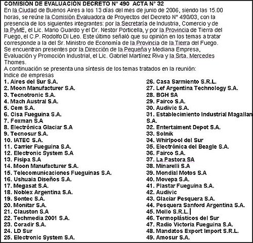 En búsqueda de ahondar en esta apreciación, iProfesional.com accedió al acta 32 de la Comisión Evaluadora de Proyectos de la Secretaría de Industria, Comercio y Pyme -fechado el 13 de junio de 2006- en el cual se hace referencia a un índice de compañías habilitadas para abrir plantas en la provincia austral.